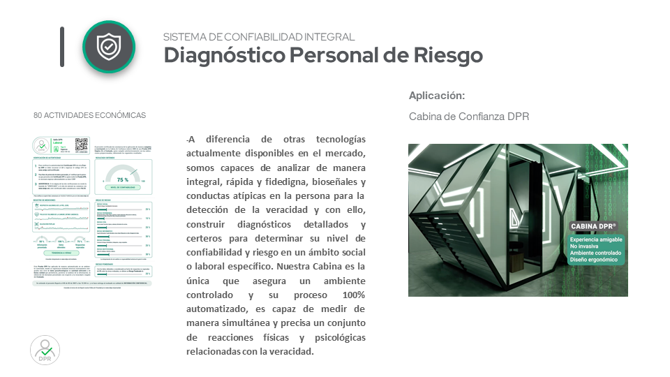 "DPR ha venido a revolucionar la aplicación de los éxamenes de control de confianza, dando una lectura rápida y precisa del personal de seguridad, logística y almacén, teniendo una mejor visibilidad para tomar decisiones y tener resultados óptimos, sin ser una herramienta invasiva."